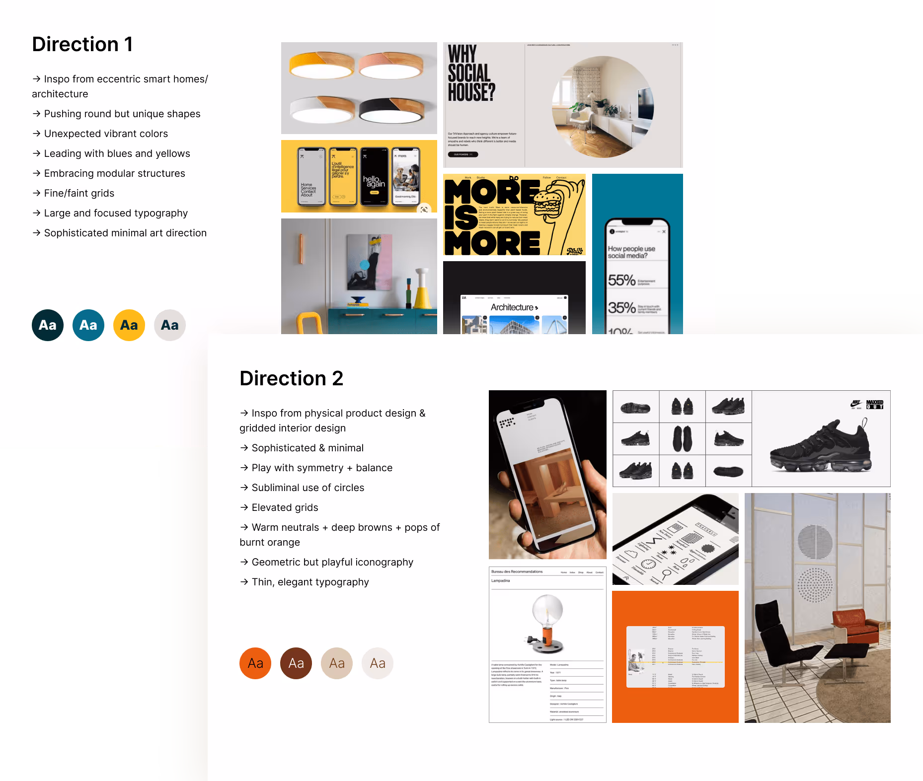 While defining what we would design, Meg Fiechter and I created brand directions. With limited information to work from, we identified areas of the brand to push and drew inspiration from the interior design aesthetics of smart homes.