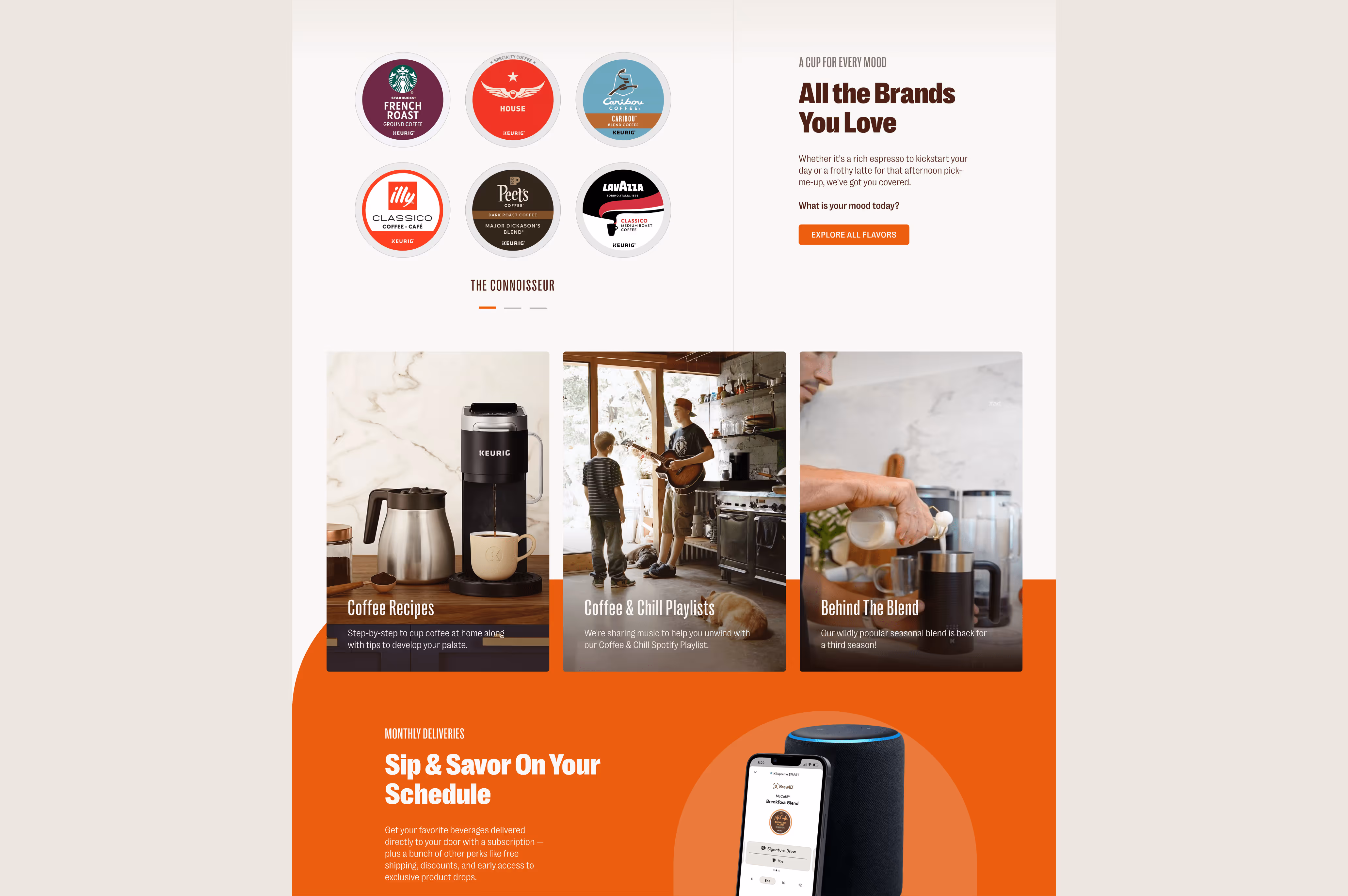 The Barista quiz functions like a virtual barista, recommending the right Keurig machines, pods, and subscription services to match individual preferences.