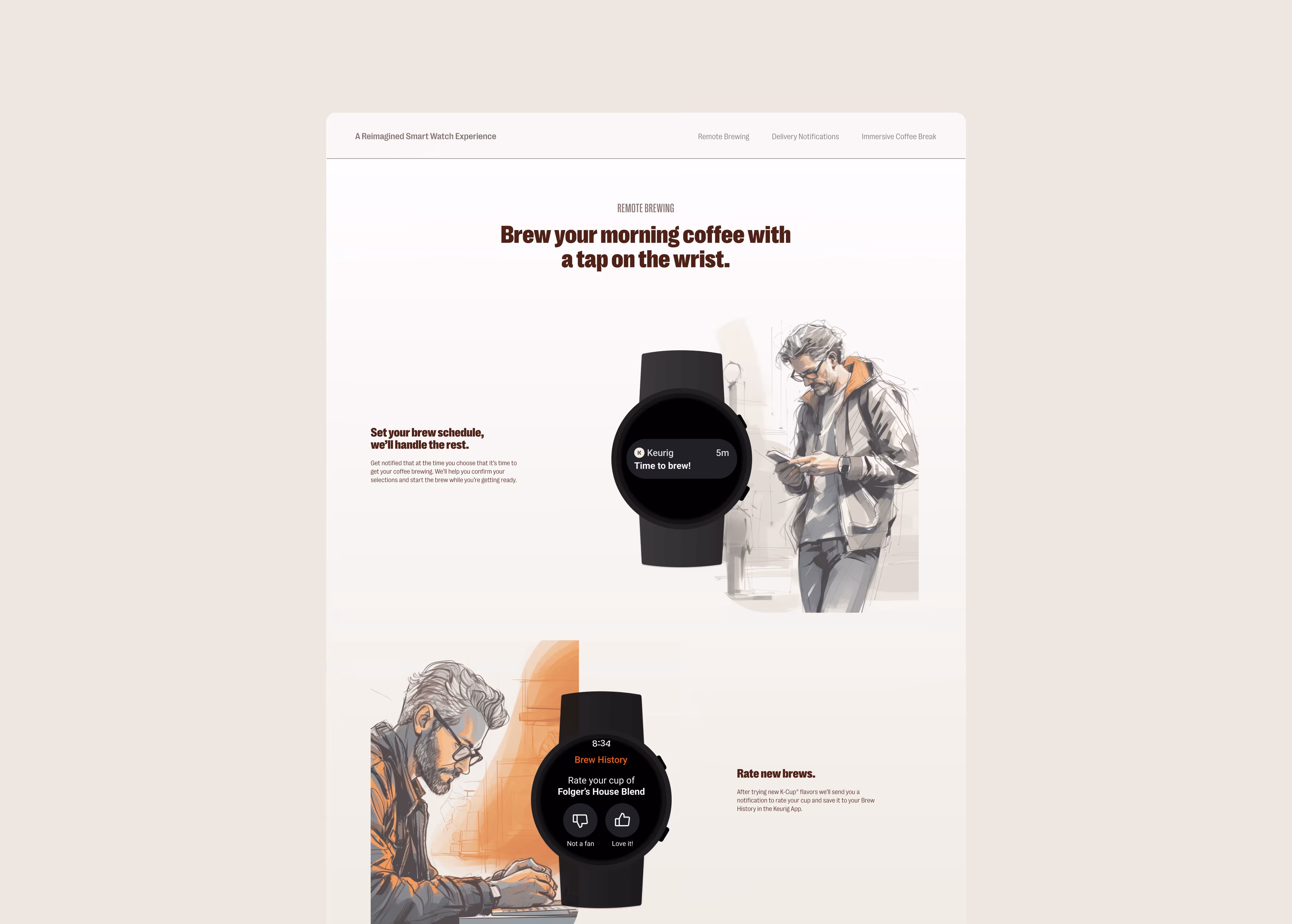 To unify the Keurig ecosystem, we created a smartwatch app that would connect to the mobile app and Keurig machines. Key features include starting a Keurig brew directly from a smartwatch, coffee break notifications, and an interactive rating system to review each cup.